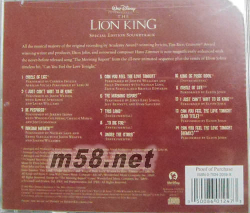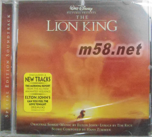獅子王 The Lion King電影原聲帶(m58.net) 榮獲奧斯卡、葛萊美等8座音樂大獎,全美暢銷超過千萬張的電影原聲帶大碟 搖滾巨星艾爾頓強、百老匯金筆提姆萊斯與「黑暗騎士」影音玩家漢斯季默聯手打造影音杰作 光榮奪下奧斯卡最佳電影主題曲大獎的抒情榜冠軍名曲"Can You Feel The Love Tonight"與氣勢磅礡的亞軍曲"Circle Of Life" [電影入座] 在遼闊的非洲草原上,小獅王辛巴為了捍衛萬獸之王的尊貴地位,勇敢面對命運考驗的冒險傳奇撼動全球影迷的心,「獅子王」以超過7億8340萬美金的票房收入,榮登全球影史10大最賣座的動畫片之列,它的電影原聲帶蟬聯全美流行專輯榜冠軍,一舉拿下奧斯卡、金球獎、葛萊美獎、全美音樂獎等跨越影壇與樂壇的8座大獎,更以千萬張的銷售紀錄獲頒美國唱片公會鉆石唱片銷售認證,無論電影或音樂,「獅子王」都是迪士尼動畫史上的傲人杰作。
