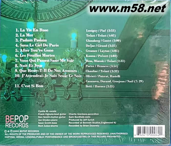 香頌夜巴黎 辛蒂亞 BISTRO BLUE(m58.net) 請點看產品正、背面大圖 想起巴黎,就會想起孕育無數愛情的塞納河畔,那些美的像詩一般的古典建筑,尤其難忘每個甜美午后、微醺夜半,不管是旁邊擺的是咖啡或是剛出廠的薄酒萊,一邊聽著最浪漫的法式香頌,就像搭著時空列車,在花都悠游一般! 由知名爵士女伶CYNIA M所演唱的最新香頌專輯[BISTRO BLUE],精選40年代以來電影配樂中的經典香頌,像是LA MER、PADAM PADAM 、LSE FEUILLES MORTES 等膾炙人口的歌曲,CYNTIA M以著不同的JAZZ典風、絲滑般的圓潤歌喉,細細詮釋每一首香頌名曲,毫無修飾的自然唱功一氣呵成,是被法國樂評譽為“香頌女王EDITH PIAF遇見八指琴魔DJANGO REIN HARDT”的年度絕佳香頌專輯!對于BISTRO BLUE,身為爵士界傳奇鋼琴家與作曲家DAVE BRUBECK 以著嚴苛的監賞力對此張專輯作下評語:“一張真正絕佳的爵士香頌,是要能喚醒人們的感官記憶,回復往英明美好的爵士情懷,面以上這些,我都從CYNTHIA的歌聲里——領略到了。飽富一各女性獨特啜嗓音的CYNTHIA,是同行里的佼佼者,歌技極盡完美的爵士女伶。我該如何為這張專輯下一個總結呢?就是CEST SI BON?。ò舸袅耍?br>或許你不曾到過巴黎,但是至少你可以聽著BISTRO BLUE ,預習如果有那么一天,你將搭著噴射機前去。如果你到過巴黎,相信你更是難忘巴黎的美好,在BISTRO BLUE釋放中,你將一再溫習花都的浪漫。