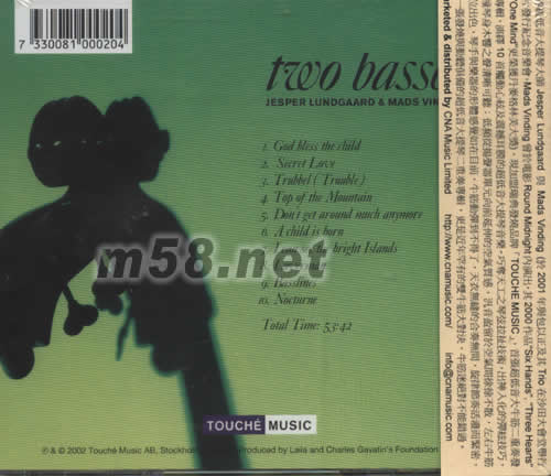 TWO BASES大牛筋雙響炮(m58.net) 瑞典爵士樂新貴 發(fā)燒錄音新體驗(yàn) 世界給低音大提琴大師 JESPER LUNDGAARD與MADS VINDING(于2001年與包以正及其TRIO在沙田大會(huì)堂舉行唱片發(fā)行紀(jì)念音樂會(huì).MADS VINDING曾于電影ROUND MIDNIGHT內(nèi)演出,其2000作品"SIX HANDS","THREE HEARTS"EY "ONE MIND"更榮獲丹麥格林美大獎(jiǎng)),現(xiàn)加盟瑞典發(fā)燒品牌[TOUCHE MUSIC],首張超低音大牛筋二重奏發(fā)燒專輯,演繹10首觸動(dòng)心弦及震撼耳膜的超低音大提琴音樂. 巧奪天工之琴弦拉扯技術(shù),出神入化的強(qiáng)弦技巧,弦撞琴身木響之聲清晰可聽; 低頻從揚(yáng)聲器單元向前延伸的空氣質(zhì)感,泛音盈留于空氣問徐徐不散,左右牛筋定位出色,琴手與樂器的形體感覺如在目前,牛筋動(dòng)強(qiáng)到不得了,天衣無縫的合奏無間,旋律節(jié)奏活潑而緊密,是一張發(fā)燒與動(dòng)聽俱備的超低音大提琴二重奏專輯,更是近年罕有的雙牛筋大對(duì)決,牛筋迷絕對(duì)不能錯(cuò)過.