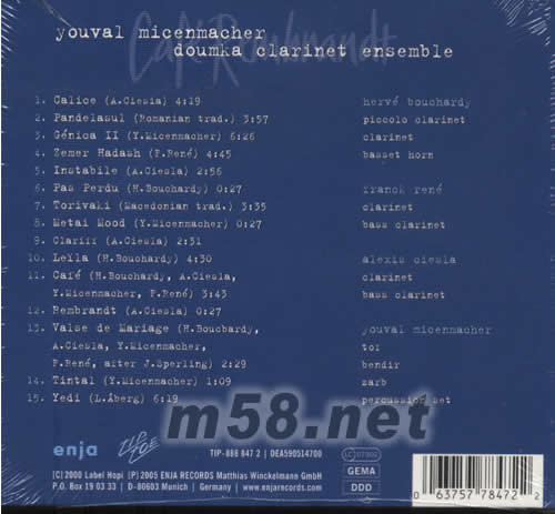 01 Calice(A.Ciesia) 02 Pande lasul(Romanian trad.) 03 Genica II(Y.Micenmacher) 04 Zemer Hadash(F.Rene) 05 Instabile(A.Ciesla) 06 Pas Perdu(H.Bouchardy) 07 Torivaki(Macedonian trad.) 08 Metai Mood(Y.Micenmacher) 09 Clariff(A.Ciesla) 10 Lella(H.BOUCHARDY) 11 Cafe(H.Bouchard,A.Ciesla,Y.Micenmacher,F.Rene) 12 Rembrandt(A.Ciesla) 13 Valse de Mariage(H.Boucbardy,A.Ciesla,Y.Micenmacher,F.Rene,after J.Sperling) 14 Tintal(Y.Micenmacher) 15 Yedi(L.Aberg)