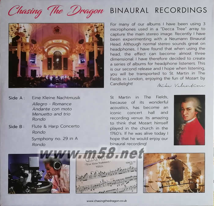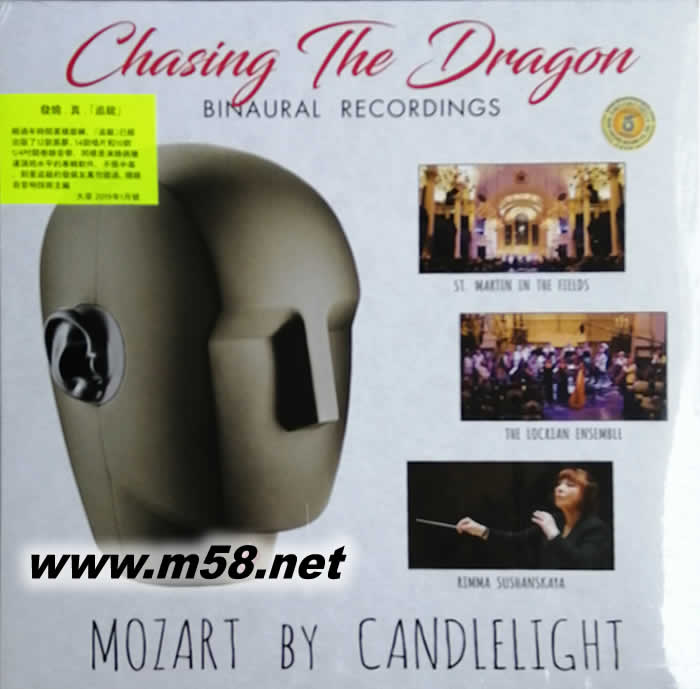 耳聽為真 第二集 追龍 Chasing The Dragon – Mozart by Candlelight Binaural Recordings 黑膠(m58.net) Chasing The Dragon追龍第一、第二集,是在英國圣馬田教堂(St. Martin in the Fields)錄音,地利。發(fā)燒咪動用了由著名收音咪品牌Neumann公司出品Binaural Head錄音方式,同步收錄當時的音訊,這入耳式錄音方式(又名人頭錄音),是將兩只靈敏度高的Neumann收音咪收藏在一個模擬人頭的耳窩里,目的是反映現(xiàn)場耳朵所接收的聲音及一切之聲效,這是最真實的聲音效果,器利。如此一來,即時可獲得如在現(xiàn)場收聽一樣的感受,真實得可怕。 莫札特長笛與豎琴協(xié)奏曲,愛爾蘭豎琴家Jean Kelly及長笛名家Fiona Kelly合作演出,兩姊妹合作天衣無繨,整座教堂美麗音效立體呈現(xiàn),左手邊是小提琴手,右手邊是低音琴手伴奏,那樣真實的感覺,就好像返回1760年!莫扎特活了!