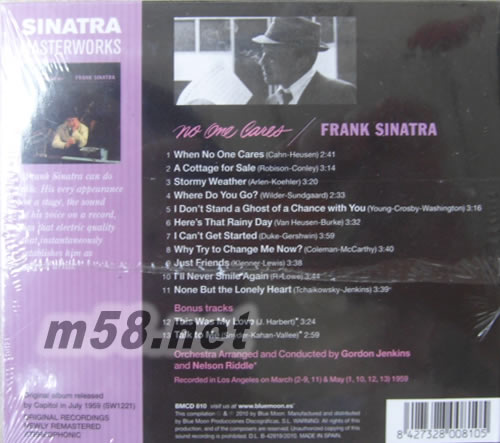 No One Cares 沒人在乎(m58.net) 法蘭克·阿爾伯特·辛納屈(Francis Albert Sinatra,1915年12月12日-1998年5月14日),美國歌手、影視演員、主持人。 1939年,隨其樂隊“Hoboken Four”加盟索尼音樂,正式開始音樂生涯 。1943年,法蘭克單飛并與哥倫比亞唱片公司簽約。1946年,發行首張個人錄音室專輯《The Voice of Frank Sinatra》。1951年,離開哥倫比亞唱片。1953年,與國會唱片公司簽約。1959年,憑借專輯《Only the Lonely》和《Come Dance with Me!》分別獲得第1屆格萊美獎“最佳專輯封面”獎和第2屆格萊美獎“藝術貢獻特殊獎”、“年度專輯”、“最佳男歌手” 。1961年,創建唱片公司Reprise Records 。1965年,獲得格萊美終身成就獎[5] 。1979年,獲得格萊美理事獎。1985年,獲得美國總統自由勛章。1995年,獲得格萊美傳奇獎。截止2015年,法蘭克·辛納屈的全球唱片銷量已超過1.5億。