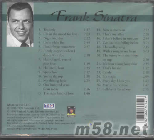 價(jià)格為估,以實(shí)到貨為準(zhǔn)! MEMBERS CDITION(m58.net) 請(qǐng)點(diǎn)看產(chǎn)品正、背面大圖 外號(hào)「瘦皮猴」的法蘭克.辛納區(qū)出生于1915年12月12日,1939年起先后加入Harry James、Tommy Dorsey樂團(tuán)擔(dān)任主唱,1942年以個(gè)人名義單飛開始了超過半世紀(jì)之久的演藝生涯。辛納區(qū)先后與多組大樂隊(duì)合作,創(chuàng)造了成串的暢銷單曲、專輯,得獎(jiǎng)記錄亦不勝枚舉,葛萊美流行男歌手或傳統(tǒng)流行演唱獎(jiǎng)多非他莫屬,1959、1965、66三次拿下年度專輯,1966年的"Strangers In The Night"同時(shí)是年度最佳單曲;五十歲那年已經(jīng)獲得了葛萊美終生成就獎(jiǎng)的殊榮。