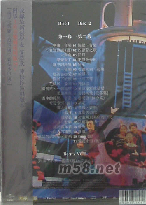 CD 1 01. 序曲 (音樂) 02. 不老的傳說 (國) 03. 大舞會(huì) 04. 感覺來了 05. 暗中的感覺 06. 夢(mèng) (音樂) 07. 是否在戀愛 08. 流星下的愿 09. 花與琴 (音樂) 10. 兩個(gè)她,一個(gè)理想 11. 愛錢萬歲 12. 湖中的提琴 (音樂) 13. 愛是永恒 (國) 14. 情人佳節(jié) 15. 抓狂 16. 雪愛狼 17. 陰謀 (音樂) 18. 歡笑嘉年華 19. 一個(gè)人的犠牲 20. 一個(gè)悲劇的開始 (音樂) CD 2 01. 監(jiān)獄 (音樂) 02. 四獄警之歌 03. 問月 04. 不想失去你 05. 怒吼 06. 老狼駕到 (音樂) 07. 希望 08. 一等再等 09. 等到你 10. 簡(jiǎn)簡(jiǎn)單單就是愛 11. 愛錢萬歲「沒落篇」 12. 雪愛狼「悼念篇」 13. 決定 14. 尋雪 (音樂) 15. 真的失去你 16. 祈求可以共你活一天 17. 只要為你活一天 18. 懺悔 19. 痛恨 20. 抱雪 (國) 21. 愛是永恒 Bonus VCD 01. 流星下的愿 Music Video 02. 抱雪 (國) Music Video 03. 愛是永恒 (國) Music Video