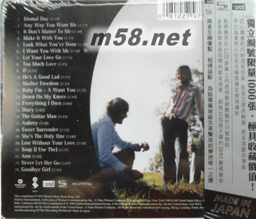 01. Dismal Day 02. Any Way You Want Me 03. It Don't Matter To Me 04. Make It With You 05. Look What You've Done 06. I Want You With Me 07. Let Your Love Go 08. Too Much Love 09. If 10. He's A Good Lad 11. Mother Freedom 12. Baby I'm-A Want You 13. Down'on My Knees 14. Everything I Own 15. Diary 16. The Guitar Man 17. Aubrey 18. Sweet Surrender 19. She's The Only One 20. Lost Without Your Love 21. Soap (I Use The) 22. Ann 23. Never Let Her Go 24. Goodbye Girl