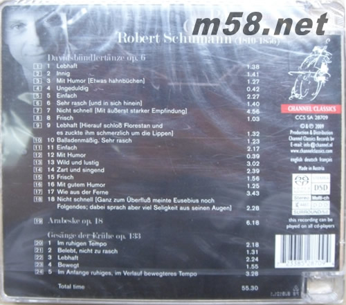 詹高馬蒂鋼琴下的舒曼作品選 Schumann SACD(m58.net) 揚(yáng)威國際樂壇的意大利鋼琴家詹高馬蒂(Paolo Giacometti)擁有深厚的鋼琴造詣、崇高的音樂素養(yǎng),經(jīng)他雙手所彈出的琴音清脆鏗鏘,充滿著絲絲細(xì)膩的感情,如魔幻般令人著迷。他的演奏更被國際權(quán)威音樂離誌讚許為”極富水準(zhǔn), 動察力高及智慧過人的鋼琴家”,足以証明他實力不凡。德國浪漫樂派作曲家舒曼(Robert Schumann)在短短的一生中創(chuàng)作過多首舉世聞名的經(jīng)典作品,其中以鋼琴作品最為人所愛戴,他的樂曲以結(jié)構(gòu)性強(qiáng)烈、曲中滲透著文學(xué)與哲學(xué)的內(nèi)涵等而見稱。詹高馬蒂本年度首張發(fā)燒演奏專輯,以長達(dá)兩年時間籌備,精心細(xì)致的制作,獨(dú)奏出舒曼的[大衛(wèi)同盟者舞曲,作品6(Davidsbundlertanze Op.6)]、[阿拉貝斯克,作品18(Arabeske Op.18)]與及[五首黎明的歌,作品133(Gesange der Fruhe Op.133)]等經(jīng)典樂章,發(fā)揮出優(yōu)秀、出色的鋼琴演奏技巧, SACD的發(fā)燒錄音效果令樂曲更加絲絲入扣,散發(fā)出鋼琴最真、最動人的韻味!