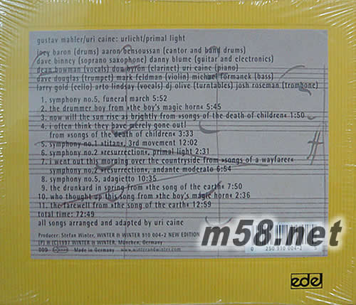 價格為估,以實到貨為準! Urlicht Primal Light(m58.net) 馬勒/肯恩〈最初的光〉 原本是為一部馬勒的記錄片而創(chuàng)作、編寫的這一組音樂,可能對所有的馬勒迷會是一個大大的驚奇。爵士鋼琴家/作曲家肯恩在徹底研究過馬勒的所有作品之後,破格使用馬勒的第一,第二,及第五交響曲的片段為靈感,發(fā)展變奏為包勃、搖滾、放客、森巴舞曲、猶太音樂…參與演出的皆是當今紐約最生猛的前衛(wèi)樂手,囊括Don Byron(黑管)、Mark Feldman(小提琴)等十多人。