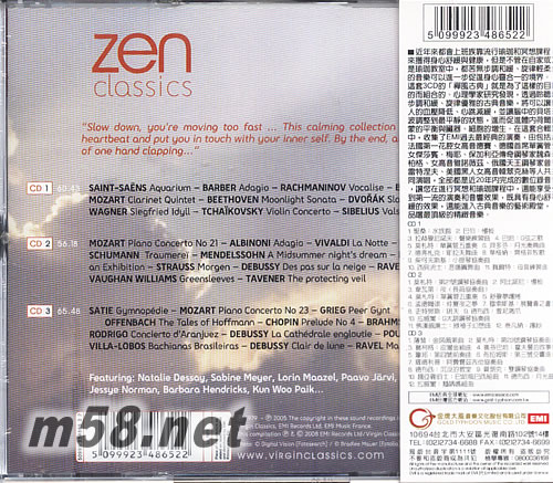 禪風古典(m58.net) 近年來都會上班族靠流行瑜珈和冥想課程來獲得身心舒緩與健康,但是不管在自家或是瑜珈教室中,都苦無步調和緩、旋律輕柔的音樂可以進一步促進身心靈合一的境界。這套3CD的「禪風古典」就是為了這樣的目的而組合的。心理學家研究發現,透過聆聽步調和緩、旋律優雅的古典音樂,將可以讓人的血壓降低、心跳減緩,並讓腦中的貝塔波調整到最平靜的狀態,進而促進體內荷爾蒙的平衡與臟器、細胞的增生。 在這套合輯中,收集了EMI過去最經典的演奏,由包括法國第一花腔女高音德賽、德國首席單簧管女杰莎賓.梅耶、保加利亞傳奇鋼琴家魏森柏格、女高音雅諾薇茲、俄國天王鋼琴家普雷特涅夫、美國黑人女高音韓翠克絲等人共同演唱,全部都是近20年內完成的數位錄音,讓您在進行冥想和瑜珈課程中,還能享受到第一流的演奏和音響效果,既具有身心舒緩的效果,還能進入古典音樂的藝術殿堂,品嚐最頂級的精致音樂。