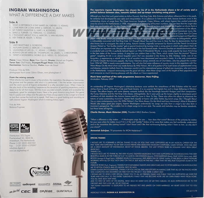 STS Digital出版的黑膠唱片絕對不多,歷年來只製作出版過數款,其中包括《Solid Acoustic Reference》、《Sound Design One》和《Sound Design Two, Gypsy Treasures》3款全屬測試類型,另一張是為Kharma成立25週年特別企劃的爵士女聲現場錄音 《An evening with Eleonora》,4款180克黑膠唱片從未出版過CD。至於《What A Difference A Day Makes》黑膠的出版,是Fritz de With收到世界各地發燒友的意見后,決定出版黑膠唱片的唯一。同屬180克壓製,整張LP輯選自原錄音內11首最 「襟聽」歌曲,從新排序,製版大師 Maarten de Boer傾力以Neumann、Weiss、Ortofon、Acoustic Solid、Clear Audio、Benz Micro、Siltech等名器泡製Fritz de With作音控監製,高尖製作效果卓越,盡將lngram Washington精彩唱藝細膩歌聲畢現無遺,強烈感人效果史無前例,聲效比CD甜潤溫暖得更細膩,音場立體感和空氣感自然至極,絕對是黑膠唱片的Hi-End頂尖級數。