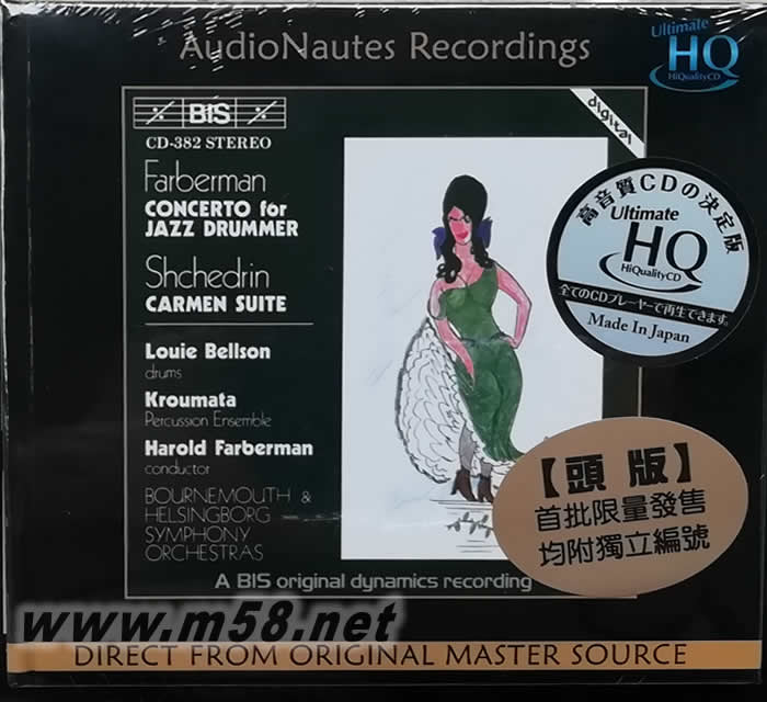 卡門組曲 Concerto to Jazz Drummer / Carmen Suite UHQCD 頭版(m58.net) 法伯曼協(xié)奏曲爵士鼓手&謝德林 敲擊卡門 ( 瑞典BIS 精心錄音/意大利AudioNautes出品 Harold Farberman 指揮/Kroumata打擊樂團(tuán) * 比才“卡門組曲”敲擊樂版本 錄音效果及悅耳的旋律 音響發(fā)燒友試音碟 由前蘇聯(lián)作曲家·謝德林改編的《卡門組曲》,是作為一出獨幕舞劇的配樂而作的。打擊樂在這專輯占了主導(dǎo)地位,與原曲的先后順序,作了重新編排,結(jié)果是讓我們聽到了一個令人頗覺新鮮有趣的,而效果格外迷人的『卡門』。喜歡打擊樂的“發(fā)燒友”,一定會聽得不亦樂乎。這首曲寫于1967年,算得上是演奏得最多的當(dāng)代曲目之一。首批限量珍藏版、附獨立編號。