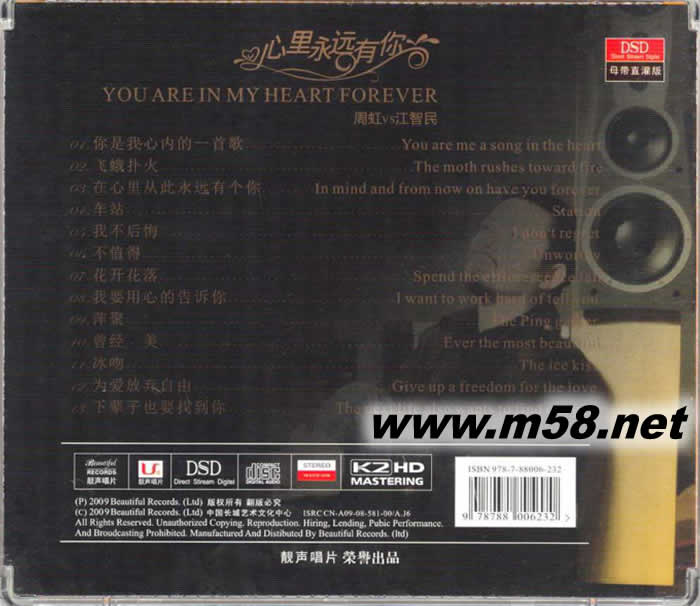 周虹 江智民 心里永遠有你 K2HD(m58.net) 江智民的聲音是全球唯一被稱為"被上帝親吻過的聲音 在經(jīng)過江智民VS周虹《其實我很在乎你》受到廣大發(fā)燒友的高度評價后,靚聲唱片應(yīng)廣大發(fā)燒友的要求,精心制作江智民VS周虹的對唱第二集《心里永遠有你》。第二集堅持了第一張專輯的選曲經(jīng)典、配器精妙、錄音嚴謹?shù)奶攸c,在歌手唱功上則是更上一層樓了;再從發(fā)燒的角度來講完全是發(fā)燒碟中的王牌,此碟的質(zhì)感、空氣感、都靚得驚人,各個樂器的擺位精準(zhǔn)了得,使得整碟低頗渾厚有力、高頻亮麗通透、中頻溫暖自然。在瑞典制作母帶時就被瑞典殿堂級錄音師譽為中國最好的錄音。