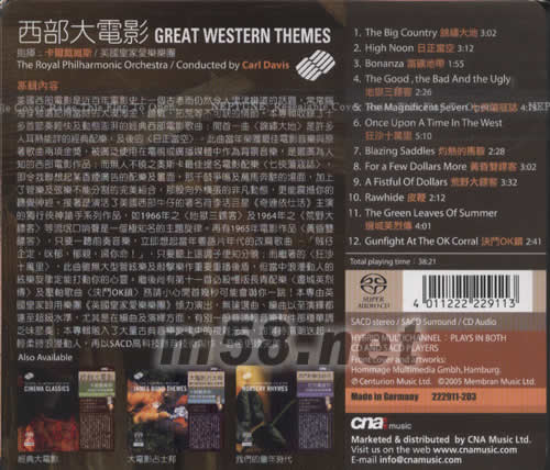 價格為估,以實到貨為準! 西部大電影GREAT WESTERN THEMES SACD(m58.net) 美國西部電影是近百年歷史上一個古老而仍然令人津津道的話題,常常腦海穿梭還記得當時的大漠淘金、槍戰(zhàn)、拓荒等不可缺的情節(jié)。本專輯收錄了十多首節(jié)奏經(jīng)快及動態(tài)澎湃的經(jīng)典西部電影歌曲;開首一曲《錦繡大地》是許多人耳熟能詳?shù)慕?jīng)典配樂,及后的《日正當空》,北、此曲當年榮獲最佳電影音樂與原著歌曲的兩項金獎,被使用在電視或廣播媒體中作為背景音樂,是最廣為人知的西部電影作品,而無人不曉之奧斯卡最佳提名電影配樂《七俠蕩寇志》,即令我聯(lián)想起某香煙廣告的配樂及畫面,那股向外橫張的非時凡動態(tài),更能震撼你的聽覺神經(jīng)。接著是演活了美國西部牛仔的著名荷李活巨星《奇連依仕活》主演的獨行俠神槍手系作品,如1966年之《地獄三鏢客》及1946年電影作品《黃昏雙鏢客》,只要聽前奏音樂,立即想起當年粵語片年代的改篇歌曲[賊仔企定,咪郁,郁親、要你命!]只要聽上這調(diào)子便知分曉;而繼著的《狂沙十萬里》,此曲雖無大型管弦樂及敲擊樂作重要重播后盾,但當中浪動人的弦樂旋律定能打動你的心靈。繼后尚有第十一首必殺慢版長青配樂《邊城英烈傳》及壓軸歌曲《決斗OK鎮(zhèn)》勿請小心開首幾秒可能會嚇你一跳!本專由英國看家卸用樂團《英國皇家愛樂樂團》傾力演出,無論選取曲、編曲以至演繹都達至超級水準,尤其是在編曲及演繹方面,有別一般普通經(jīng)音樂軟件那種單調(diào)乏味節(jié)奏;本專輯融入了大量古典音樂旋律中的復雜元素,澎湃時高潮迭起,經(jīng)柔時浪漫動人,再以SACD高科技錄音技術(shù)制作,音色更臻完美!!!