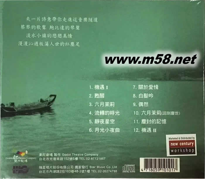 機(jī)遇(淡水小鎮(zhèn)原聲帶)CD(綠色封面)(m58.net) 在此張像散文詩(shī)般優(yōu)美、如水墨畫般清雅的音樂(lè)劇原聲唱片——《淡水小鎮(zhèn)》中,蔡琴柔美的哦吟配上大段的內(nèi)心獨(dú)白,于樸素寧謐中抒發(fā)出一個(gè)平凡女性對(duì)人世紅塵的戀戀真情,靜靜聽來(lái)如空氣中飄灑的陣陣茉莉花香,美得讓人魂飛魄散!有人說(shuō)這張唱片像是喬治•云斯頓作品的中文演唱版,因?yàn)檎麖埑信c蔡琴相伴的,絕大部分是如水中倒影般的鋼琴?gòu)椬唷F鋵?shí)包辦全碟編曲和鋼琴演奏的,是香港音樂(lè)奇才鮑比達(dá)。他的才華同樣讓人驚嘆,那一手洋溢著深厚古典氣息,又流瀉出無(wú)比靈氣的鋼琴,簡(jiǎn)約透明,晶瑩清澈,像月光下顆顆的露珠,靜靜滴落,驚動(dòng)了一泓秋水。尤其是音符間余音裊繞的“留白”,更是給人以無(wú)限的遐想。