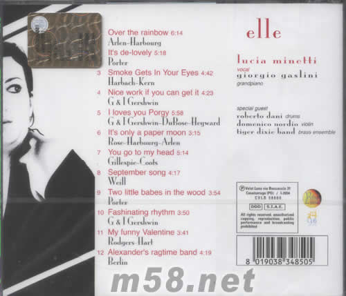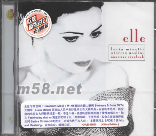 價格為估,以實到貨為準! ELLE(m58.net) 全張專輯使用上NEUMANN M147/M149膽咪收錄人聲與STEINWAY & SONS D274 大鋼琴,LUCIA MINETTI 美麗動人的聲音好象站立在大鋼琴旁,向聆聽者低唱,她安 穩穩的唱腔如大師級歌唱家一般,不急不躁,緩緩聽著鋼琴的拍子慢慢地唱出來,她 在 FASHINATING RHYTHM 刻意的把嗓子壓下來的唱法,十分性感,其余在高音演繹出如 同 BARBRA STREISAND 的腔音,功駕當然不失人前。本碟使用上SADIE 5 作 MIX AND MASTERING,音效出眾,暖逶心窩。