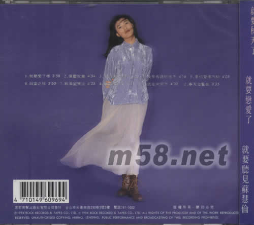 就要愛了嗎(m58.net) 首度首張真心貼心專輯 推薦歌曲:慧倫加盟滾石首張大碟 就要愛了嗎 娓娓道出期待愛情真心渴望,引人心動(dòng) 六位知名制作首度合作 揮霍寂寞 深情演唱張宇新作,展露無限柔情 十首動(dòng)人情歌真心推薦 愛你讓我勇敢 首度與杜德偉情歌對(duì)唱,甜蜜溫馨 把握今秋戀情貼心告白 沒有去過的地方 齊豫 秦潤別力作,詮釋感受生命中的鳥語花香