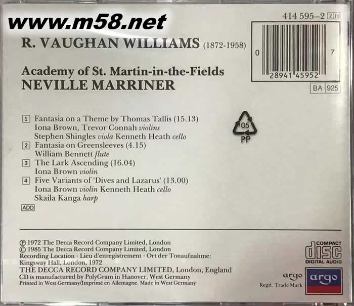 沃恩·威廉斯:綠袖子幻想曲 Vaughan Williams:Fantasia On Greensleeves(m58.net) 《綠袖子幻想曲》是沃恩?威廉斯的代表作品。此曲意韻悠遠,充滿幻想的意趣,讓人浮想聯翩,又略帶一絲憂傷,全曲聽來纏綿而悠揚,優美而清亮,抒情性極濃。《綠袖子》是一首英國民謠,這首民謠的旋律是非常古典而優雅的,是一首描寫對愛情感到憂傷的歌曲,但它受到世人喜愛的層面卻不僅僅局限在愛情的領域,有人將它換了歌詞演唱,也有人將它作為圣誕歌曲,而它被改編為器樂演奏的版本也是多不勝數,有小品、有室內樂、有管弦樂。 這套《沃恩?威廉斯:綠袖子幻想曲》同時收錄的還有《塔里斯主題幻想曲》等著名作品,由內維爾?馬里納爵士(Sir Neville Marriner)指揮圣馬丁樂團演奏錄制而成。 內維爾?馬里納(Neville Marriner)1924年4月15日出生于英國林肯。在英國馬里納以指揮圣馬丁樂團(ASMF)出了名,奠定了他指揮家的地位。圣馬丁樂團創建1959年,馬里納一直擔任團長至1978年,其間為Decca、Philips、EMI等唱片公司錄制了大量巴羅克和古典時期音樂的優秀唱片,其中許多榮列企鵝三星帶花、《唱片藝術》最佳金曲名榜。1978-1985年出任美國明尼蘇達管弦樂團音樂總監,1981年又兼任斯圖加特廣播交響樂團首席客座指揮。1979年,馬里納獲得大英帝國爵士勛章,1985年被授予爵士。 馬里納一生中的主要貢獻除了非常出色地領導了美國明尼蘇達交響樂團以外,另外一個便是他親手組建和培養了后來享譽世界的圣馬丁室內樂團。圣馬丁室內樂團是當今世界上最著名的室內樂團,它的合奏效果極其純靜和細膩,樂隊的音色甜美而富有潤澤感,其織體和層次亦顯得非常清晰和有條理。人們在聽了這個樂隊的演奏之后,第一個感覺就是這個隊具有著豐富的魁力和極有修養的藝術情趣,以上這一切特點的形成,其主要的功績都應該歸功于馬里納對這個樂團的長期培養和訓練。