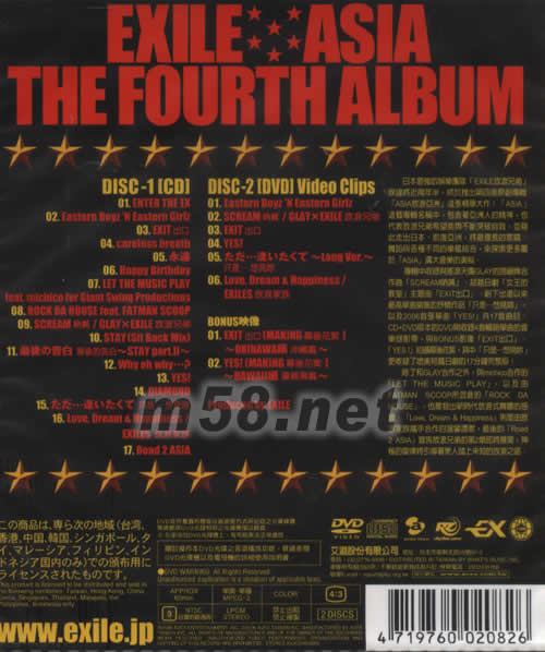 DISC 1 1. ENTER THE EX 2. Eastern Boyz 'N Eastern Girlz 3. EXIT出口 4. careless breath 5. 永遠 6. Happy Birthday 7. LET THE MUSIC PLAY feat. michico for Giant Swing Productions 8. ROCK DA HOUSE feat. FATMAN SCOOP 9. SCREAM吶喊 / GLAY×EXILE放浪兄弟 10. STAY [Sit Back Mix] 11. 最后的告白~STAY part.II~ 12. Why oh why…? 13. YES! 14. DIAMOND 15. 只是…想見妳 16. Love, Dream & Happiness / EXILES放浪家族 17. Road 2 ASIA DISC 2 1. Video Clips—Eastern Boyz 'N Eastern Girlz 2. Video Clips—SCREAM吶喊 / GLAYxEXILE放浪兄弟 3. Video Clips—EXIT出口 4. Video Clips—YES! 5. Video Clips—只是…想見妳~Long Ver.~ 6. Video Clips—Love, Dream & Happiness /EXILES放浪家族 BONUS映像 1. BONUS影像—EXIT出口 [MAKING] 2. BONUS影像—YES! [MAKING]