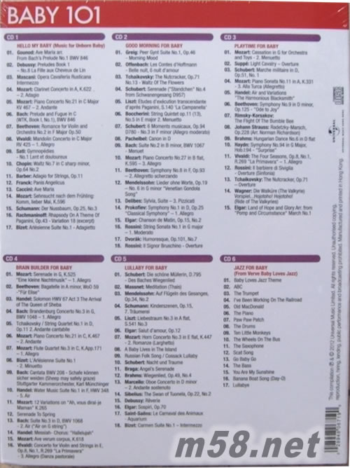 BABY 101 最愛BB音樂 寶寶101(m58.net) 給寶寶的第一份禮物 祝福從孕育的那一天開始 古典&爵士101首優生經典 激發好奇寶寶探索世界的無限潛能 CD1: 胎兒寶寶, 安定舒緩快長大 CD2: 早安寶寶, 元氣充沛不賴床 CD3: 快樂寶寶, 游戲學習不費力 CD4: 好奇寶寶, 潛能開發金頭腦 CD5: 晚安寶寶, 不吵不鬧好好眠 CD6: 爵士寶寶, 音感律動一級棒 爸比媽咪想給你全世界,先從第一份禮物【寶寶101】開始… 「聽覺」可以說是寶寶和外在世界的第一次接觸,而「音樂」則扮演了很重要的媒介角色。許多醫學研究和育兒專家都肯定古典音樂有助于嬰幼兒聽覺神經的發育和成長,因為古典音樂的節奏與人體脈搏相等,旋律的起伏與小寶寶的呼吸頻率最吻合。在日常生活中給予寶寶適度的音樂刺激,是相當自然有效的教育法寶,同時也具有安定情緒和舒緩的作用。專家建議,父母可以及早讓寶寶接觸古典音樂,甚至在胎兒時期就可以開始嘗試,因為愉悅、和緩的音樂有助于胎兒腦部產生α波,左右腦更容易進行協調及溝通,對寶寶的記憶力與專注力有所幫助。環球音樂細心挑選的【寶寶101】6CD禮盒,針對家中寶貝成長階段的不同需求,嚴選巴哈、莫札特、貝多芬、舒伯特、韋瓦第、韓德爾等偉大作曲家的101首經典名曲,另外還加入童趣十足的爵士搖擺音樂,非常適合親子的互動。【寶寶101】讓您的寶貝從孕育到出生的嬰幼兒時期,都能在音樂的薰陶下健康成長,更希望藉此啟發寶寶們的智能與創造力。
