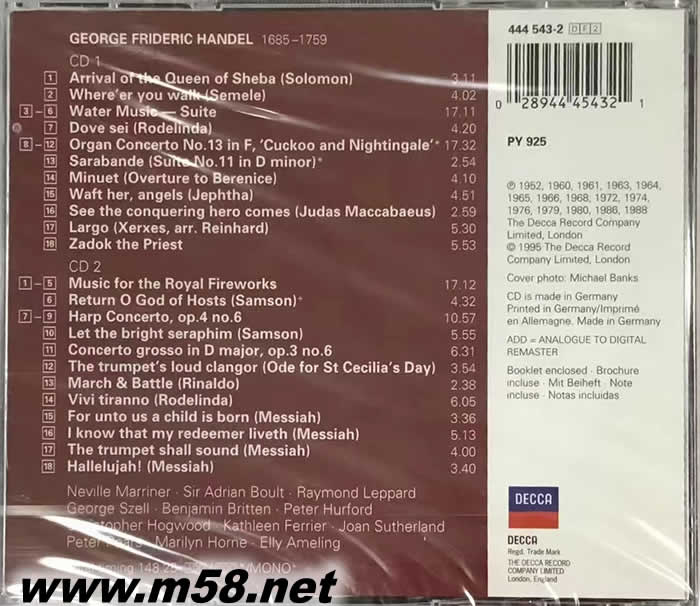 韓德爾精華名作 The Essential Handel(m58.net) 哈利路亞大合唱、席巴女王的進場、水上音樂、皇家煙火等 馬利納、霍格伍德等名家聯合演出 巴洛克音樂大師韓德爾是與巴哈齊名的巨擘,他融匯當代名家技巧及富麗的風格於一身,淬煉出直接、自信且具親和力的諸多名作,為后世無窮無盡的音樂寶庫之一。哈利路亞大合唱、席巴女王的進場、水上音樂、皇家煙火等諸耳熟能詳之經典如今全數收錄在這套「韓德爾精華名作」中。擔任演出之名家馬利納、霍格伍德、包爾特及赫福德等均嫻熟於韓氏之風格,詮釋亦自成一家之言,無疑是您跨入韓德爾世界的絕佳選擇。