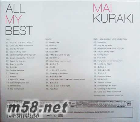 ALL MY BEST(初回限定臺灣版)(m58.net) 自「Love, Day After Tomorrow」的衝擊出道以來10年… "倉木麻衣",10年間這10年寫照的無數人氣曲….! 自全美出道曲「Baby I Like」 至最新曲「わたしの、しらない、わたし?!?我所不知的我的另一面) (KOSE 「ESPRIQUE PRECIOUS」CM SONG / CD 首次收錄), 滿載濃縮這10年的人氣曲, 永久保存精選集! 初回限定盤2CD+DVD〔LIVE〕 特典: 收錄 DVD/ MAI KURAKI LIVE SELECTION 80分 附Mai Kuraki x Director’s Special Talk 全部影像皆從LIVE中嚴選收錄而成!附本人的聲音解說! 豪華BOX特殊包裝