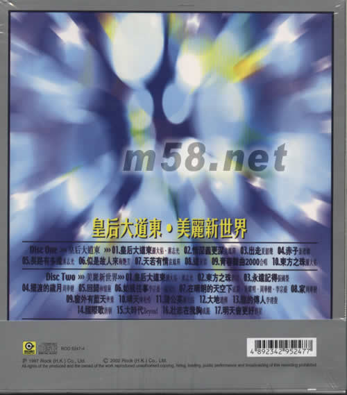 Disc One 皇后大道東 01. 皇后大道東 - 羅大佑 蔣志光 02. 情深義更深 - 袁鳳瑛 03. 出走 - 夏韶聲 04. 赤子 - 葉德嫻 05. 長路有多遠 - 蔣志光 06. 似是故人來 - 梅艷芳 07. 天若有情 - 袁鳳瑛 08. 道 - 黃沾 09. 青春舞曲2000 - 合唱 10. 東方之珠 - 羅大佑 Disc Two 美麗新世界 01. 皇后大道東 - 羅大佑 蔣志光 02. 東方之珠 - 群星 03. 永遠記得 - 張國榮 04. 擺渡的歲月 - 周華健 05. 回歸 - 林憶蓮 06. 如風往事 - 李宗盛 盧冠廷 07. 在晴朗的天空下 - 成龍 黃耀明 周華健 李宗盛 08. 家 - 周華健 09. 窗外有藍天 - 齊豫 10. 晴天 - 陳松伶 11. 蒲公英 - 羅大佑 12. 大地 - 趙傳 13. 龍的傳人 - 李建復 14. 國際歌 - 唐朝 15. 大時代 - Beyond 16. 壯志在我胸 - 成龍 17. 明天會更好 - 群星