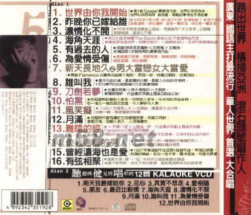 disc 1 01. 世界由你我開始 02. 昨晚你已嫁給誰 03. 濃情化不開 04. 海角天涯 05. 有過去的人 06. 為愛情受傷 07. 新天長地久之男大當戀女大當愛 08. 誰叫我 09. 刀劍若夢 10. 怕黑 11. 風笑癡 12. 月滿 13. 難念的經(第一卷.西班牙版) 14. 像我這樣的男人 15. 曾經滄海也是愛 16. 有弦相聚 disc 2 聽健唱12首KALAOKE VCD 01. 明天我要嫁給你 02. 花心 03. 其實不想走 04. 愛相隨 05. 朋友 06. 最近比較煩 07. 海角天涯 08. 濃情化不開 09. 月滿 10. 誰叫我 11. 為愛情受傷 12. 世界由你我開始