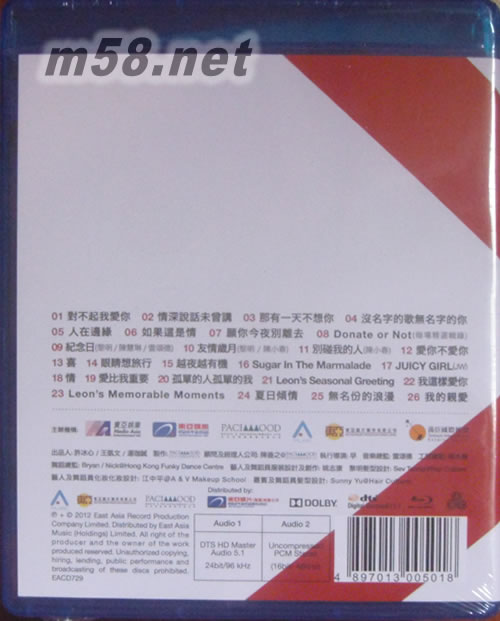 黎明2011年 “LEON X U” 紅館演唱會 ( Blu-ray Disc ) 除收錄黎明新舊精選歌曲 另特別收錄嘉賓 陳慧琳 / 陳小春 及JW演出 * 高畫質(zhì) 及 高質(zhì)音效 藍光光碟 (BD50) ‧HD全高清1920 X 1080拍攝 ‧Un-compressed PCM 5.1 16bit/48kHz ‧dts HD Master Audio 5.1 24bit/96kHz ‧Dolby Digital Stereo 24bit/48k Hz 01. 對不起我愛你 02. 情深說話未曾講 03. 那有一天不想你 04. 沒名字的歌無名字的你 05. 人在邊緣 06. 如果這是情 07. 愿你今夜別離去 08. Donate or Not(每場精選輯錄) 09. 紀念日(黎明 陳慧琳 雷頌德) 10. 友情歲月(黎明 陳小春) 11. 別碰我的人(陳小春) 12. 愛你不愛你 13. 喜 14. 眼睛想旅行 15. 越夜越有機 16. Sugar In The Marmalade 17. JUICY GIRL(JW) 18. 情 19. 愛比我重要 20. 孤單的人孤單的我 21. Leon's Seasonal Greeting 22. 我這樣愛你 23. Leon's Memorable Moments 24. 夏日傾情 25. 無名份的浪漫 26. 我的親愛