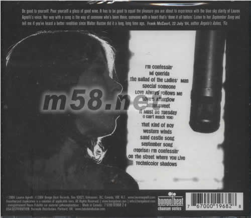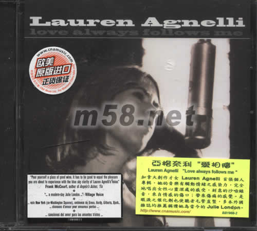 愛相隨LOVE ALWAYS FOLLOWS ME(m58.net) 加拿大創作才女LAUREN AGNELLI首張個人專輯,她的音樂有觸動情緒之感染力,完美地唱出女性心靈深處的感受,刻意的沙啞錄音,來自情感的傷口;帶來傷痛的感覺。是眼淚之催化劑也使聽者毛管直豎,多本外國親讀均推薦稱贊她為當今的JULIE LONDON。