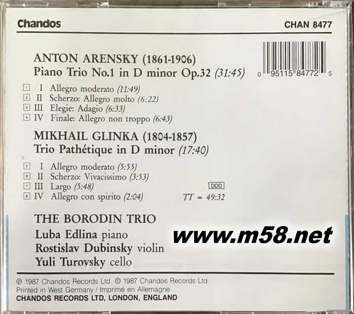 阿倫斯基 鋼琴三重奏ARENSKY & GLINKA: PIANO TRIOS(鋼琴、小提琴、大提琴)(m58.net) THE BORODIN TRIO LUBA EDLINA 鋼琴 ROSTISLAV DUBINSKY 小提琴 YULI TUROVSKY 大提琴