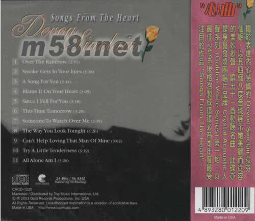 擅于表達(dá)內(nèi)心感情的Devon Sinclair 荻芬·仙姬,以其四個(gè)八度音域展示她美麗而從容的美妙歌聲,唱出十一首動(dòng)聽(tīng)名曲。此碟亦是享譽(yù)發(fā)燒圈唱片品牌Crystal Acoustic人聲系列(Golden Voice Series)第一炮,以最佳24/96規(guī)格泡制成這張必為本年度最愛(ài)注目的作品“Songs From The Heart"