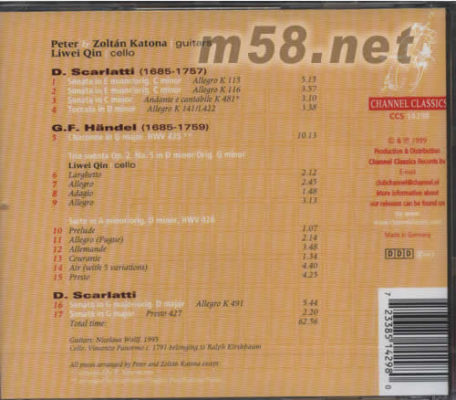 1 Sonata in E minor/orig.c minor Allegro K 115 2 Sonata in E minor/orig.C minor Allegro K 116 3 Sonata in C minor Andante e cantabile K 481 4 Toccata in D minor Allegro K141/L422 5 Chaconne in G major,HWV 435 Trio sonata Op.2,No.5 in D minor/Oring.G minor 6 Larghetto 7 Allegro 8 Adagio 9 Allegro 10 Prelude 11 Allegro(Fugue) 12 Allemande 13 Courante 14 Air(with 5 variations) 15 Presto 16 Sonata in G major/orig.D major Allegro K 491 17 Sonata in G major Presto 427