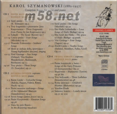 CD1 1-6 Szesc piesni-Six Songs(K.Tetmajer)op.2 7-9 Trzy fragmenty Z poematow Jana Kasprowicza-Three Fragments from Poems by Jan Kasprowicz op.5 10 Labedz-The Swan(Berent)op.7 11-14 Cztery piesni-Four Songs(Micinski) op.II 15-17 Piosenki Zolnierskie-Soldiers's Songs 18 Idom se siuhaje dolu,spiewajecy-Young highlanders descend,singing 19-23 Funf Gesange-Five Songs(Dehmel,Des Knaben Wunderhorn,Bodenstedt,Bierbaum) op.13 24-26 Trzy piesni-Three Songs(D.Dawydov)op.32 CD2 1-5 Bunte Lieder-Colourful Songs(Bulcke,Paquet,Faktor,Ritter,Huch) op.22 6-11 Piesni muezina szalonego-Songs of the Infatuated Muezzin(Iwaszkiewicz)op.42 12-18 Seven Songs(James Joyce)op.54 19-30 Piesni Kurpiowski-Kurpian Songs op.58 31 Dans les pres fleuris-In the flowering meadows CD3 1-6 Szesc piesni-Six Songs(Micinski) op.20 7-12 Des Hafis Liebeslieder-Love Songs of Hafis(Bethge) op.24 13 Das Grab des Hafis-(Bethge)OP.posth. 14-17 Vier Gesange-Four Songs (Taore) op.4I 18-29 Zwolf Lieder-Twelve Songs (Dehmel,Mombert,Falke,Greif) Op.17 CD4 1-6 Piesni ksiezniczki z basni-Songs of the Fairy Princess(Z.Szymanowska) Op.3I 7-11 Slopiewnie-Slopiewnie(Tuwim) Op.46 bis 12-14 Trzy kolysanki-Three Lullabies(Iwaszkiewicz) op.48 15-34 Rymy dzieciece-Children's Rhymes(Illakowicz) op.49 35 Vocalise-Erude 36 Samotny ksiezyc-Lonely moon op.3I nr I(A)