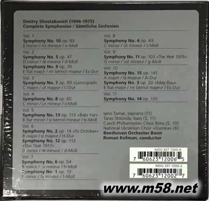 肖斯塔科維奇 交響曲全集 SHOSTAKOVICH COMPLETE SYMPHONIES SAMTLICHE SINFONIEN BEETHOVEN ORCHESTER BONN(11CD套裝)(m58.net) 肖斯塔科維奇,原蘇聯時期*重要的作曲家之一,20世紀世界著名作曲家之一 羅馬科夫曼(指揮)/波恩貝多芬管弦樂團/這一場是精彩的表演,細膩的聲音被細致的構建,高精度的傳遞,但旋律線的味道——所謂的最具音樂性的“美”! MDG 是一個追求發燒品質的古典唱片小廠---錄音無可挑剔。創立時期,它確立了追求“自然”的錄音哲學,包括:自然的樂器、人聲音色,自然的空間聲響,自然的寬廣度再現,樂器間自然的平衡感,樂器的自然動態和演奏錄音的自然流動感。此外考慮到重播的空間會決定重播的品質,又提出了空間的三要素:擺位、三度空間與現實狀況的概念。 MDG 在世界各地尋找合適的錄音場所,制作了不少演錄俱佳的唱片,也挖掘出許多優秀的演奏家與團體。較重要的有漢堡交響樂團、18世紀室內合奏團(Camerata of the 18th Century),演奏家豎笛教授克勒克爾(Dieter Kloecker)、管風琴家奧斯登(Ben van Oosten)等。在 MDG 錄音的的音樂家,大多兼俱學者的身份,因此錄音格外富于人文氣息。
