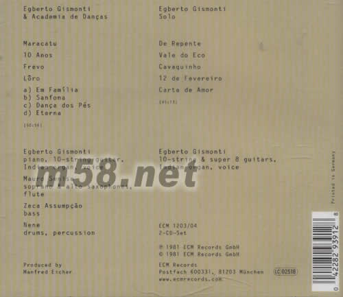 SANFONA EGBERTO GISMONTI & ACADEMIA DE DANCAS(m58.net) 作為吉它手、鋼琴手兼作曲人的Egberto Gismonti,主張將爵士樂、歐洲傳統音樂及出自南美雨林的奇特聲效,對等地交織在音樂里 Academia De Dancas 丹卡斯學院樂團. 在本專輯中,EGBERTO GISMONTI負責 鋼琴,10弦吉它、大提琴 印度風琴、唱歌 MAURO SENISE負責 女高音,自動Bossa Nova爵士薩克 斯、長笛 ZECA ASSUMPCAO 貝斯手 NENE 鼓手,打擊樂手