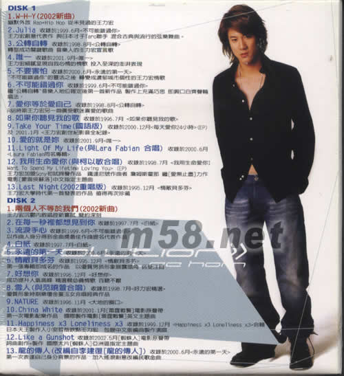 音樂進(jìn)化論'95-'02(臺(tái)灣版)(m58.net) 王力宏新新歌加精選碟《王力宏音樂進(jìn)化論》中首度嘗試寫中文歌詞,究竟王力宏的音樂「進(jìn)化」到什麼程度?他自己形容是「金蟬脫殼」,雖然早已得過金曲雙料歌王,但他一直希望能用中文為自己的作品填詞,這樣音樂和想要表達(dá)的理念才能百分之百的合而為一。 新歌「W-H-Y」是以戲謔方式,點(diǎn)出唱片市場(chǎng)的蕭條,把盜版、狗仔隊(duì)、獨(dú)家KTV、「紅配綠」都寫進(jìn)歌裡,又巧妙地把好友「阿菲」、「阿妹」張惠妹及陶吉吉也寫進(jìn)「W-H-Y」的詞裏,甚至字裡行間還出現(xiàn)「Gay」的字眼。配上Hip Hop饒舌曲風(fēng)之後,果然令人耳目一新。 為封套拍攝照片時(shí),穿著黑色背心的王力宏,露出結(jié)實(shí)的臂膀肌肉,必定令他的樂迷呼叫!