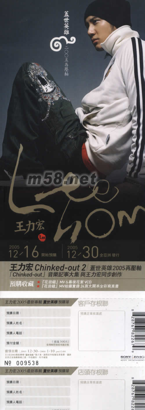 價格為估,以實到貨為準! 蓋世英雄(臺灣正常預購版)(m58.net) 此版本沒有貨了,可改訂香港版的。 先期付款的顧客請注意,以現在到貨的版為準! 凡不留言特別說明的,全按此版本發貨. 注:臺版寫真在贈品里面,香港版的寫真是與贈品是分開 蓋世英雄正常版預購禮 [CHINKET-OUT]音樂記事大集,與王力宏同步 1、花田錯MV與幕后花絮VCD 2、花田錯MV拍攝實錄24頁大開本全彩寫真書 首支主打單郵[花田錯]MV&創作歷程