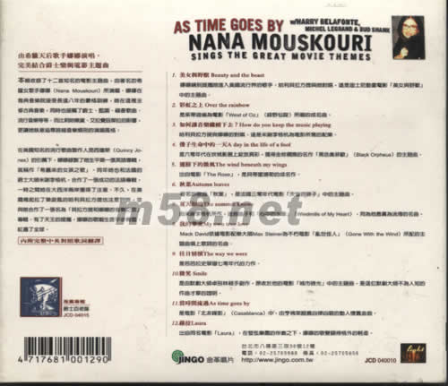 1 美女與野獸(Beauty And The Beast) 娜娜請到提攜她進入美國流行界的歌手:哈利貝拉方提與她對唱,這是迪士尼動畫電影[美女與野獸]中的主題曲. 2 彩虹之上(Over The Rainbow) 是茱蒂迦倫電影[WEST OF OZ](綠野仙蹤)所唱的成名曲 3 如何讓音樂繼續下去?(How Do You Keep The Music Playing) 哈利貝拉方提與娜娜的對唱,這是米謝李格杭為電影所寫的配樂. 4 傻子生命中的一天(A Day In The Life Of A Fool) 是六零年代在坎城影展上綻放異彩,獲得金棕櫚獎的名作[黑色菲歐](BLACK ORPHEUS)的主題曲. 5 翅膀下的微風(The Wind Beneath My Wings) 出自電影[THE ROSE],是貝蒂蜜德勒的成名作. 6 秋葉(Autumn Leaves) 著名的歌曲[秋葉],是法國三零年代電影[天堂的孩子]中的主題曲. 7 夏天知曉(The Summer Knows) 由米謝李格杭所作,這首曲子和[心中的水車](WINDMILLS OF MY HEART),同為他最廣為流傳的名曲. 8 我的摯愛(My Own True Love) MACK DAVID依據電影配樂大師MAX STEINER為不朽電影[亂世佳人](GONE WITH THE WIND)所配的主題曲填上歌詞的名曲. 9 往日情懷(The Way We Were) 是芭芭位史翠珊七零年的力作. 10 微笑(Smile) 是由默劇大師卓別林親手創作,原收于他的電影[城市微光]中的主題曲,是這位默劇大師不為人知的作曲才華的證明. 11 當時間流過(As Time Goes By) 是電影[北非諜影](CASBLANCA)中,由亨佛萊鮑嘉自彈自唱的動人懷舊金曲. 12 蘿拉(Laura) 出自同名電影[LAURA],在管弦樂團的伴奏之下,娜娜的歌聲顯得格外的輕柔.