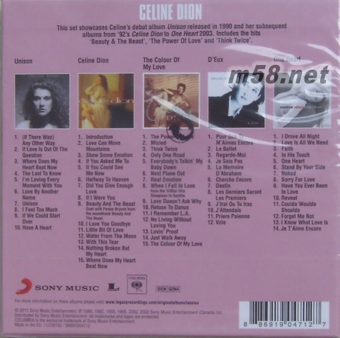 Original Album Classics 經典專輯全集5CD套裝(m58.net) ★紀錄第一! 5座葛萊美獎、2座奧斯卡、「史上銷售最佳女性流行藝人」、「傳奇藝人」大獎… ★銷售第一! 2億張唱片銷售、19張冠軍作品 ★情歌第一! 出道30年擁有42首冠軍單曲 ★首次集結5張暢銷千萬個人專輯: Unison、Celine Dion、The Colour Of My Love、D’Eux、One Heart全球限量盒裝珍藏發行