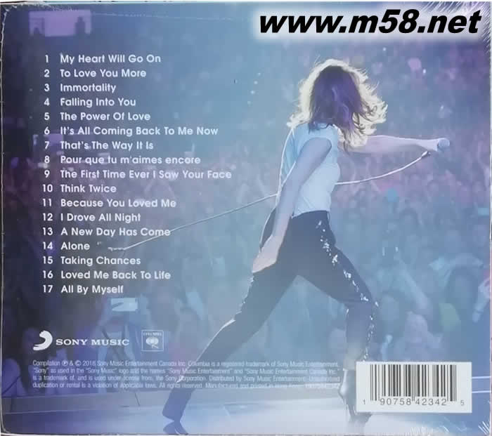1. My Heart Will Go On 愛無止盡 史上經典電影「鐵達尼號」主題曲,橫掃奧斯卡+金球+葛萊美各大獎 2. To Love You More 愛不完 與葉加瀨太郎替日劇「戀人啊!」共通演繹主題曲,日本銷售突破120萬張 3. Immortality 不朽 與「搖滾名人殿堂」會員、史上最成功家族樂團比吉斯跨刀合音動人情歌 4. Falling Into You 深愛著你 翻唱阿根廷女歌手Marie-Claire D’Ubaldo同名佳作,拿下希臘+西班牙兩國冠軍 5. The Power Of Love 愛的力量 翻唱搖滾女將Jennifer Rush成名曲,風光霸佔美國流行榜四週冠軍 6. It`s All Coming Back To Me Now 重新擁有 長達七分多鐘,最氣勢磅礡的淒美情歌鉅作,穩坐美國+加拿大成人抒情榜冠軍 7. That`s The Way It Is 愛的方式 布蘭妮、新好男孩、超級男孩暢銷曲幕后功臣Max Martin掌舵輕快小品 8. Pour Que Tu M`aimes Encore 再愛我一次 最招牌法文歌曲,拿下法國Felix Award「年度最受歡迎歌曲」大獎肯定 9. The First Time Ever I Saw Your Face 一見鐘情 翻唱Ewan MacColl 寫給Peggy Seeger的民謠經典,重新以當代情歌唱腔詮釋 10. Think Twice 三思而行 專輯【The Colour Of My Love】中第4主打歌,榮獲7國冠軍的超強單曲 11. Because You Loved Me 因為你愛過我 勞勃瑞福和蜜雪兒菲佛演出電影「因為你愛過我」冠軍主題曲,抱走葛萊美獎 12. I Drove All Night 為愛奔馳 已故傳奇Roy Orbison深受好評之作,搭配克萊斯勒Chrysler Pacifica汽車廣告 13. A New Day Has Come 真愛來臨 懷孕生子后重返舞臺榮耀回歸,依然不敗的守住美國+加拿大成人抒情榜后冠 14. Alone 孤獨 翻唱女聲搖滾樂團Heart最經典名作,勇闖加拿大成人單曲榜TOP 7席次 15. Taking Chances 為愛冒險 葛萊美加持製作大師John Shanks(凱莉克萊森、邦喬飛)掌舵,飛奔舞曲榜冠軍 16. Loved Me Back To Life 讓愛重生 不露臉天后Sia參與撰寫,登記MTV頻道:「當週必聽五首流行歌曲」名單 17. All By Myself 孤單一人 Eric Carmen紅翻全球超級金曲,再添成人抒情榜冠軍記錄,獲頒金唱片認證