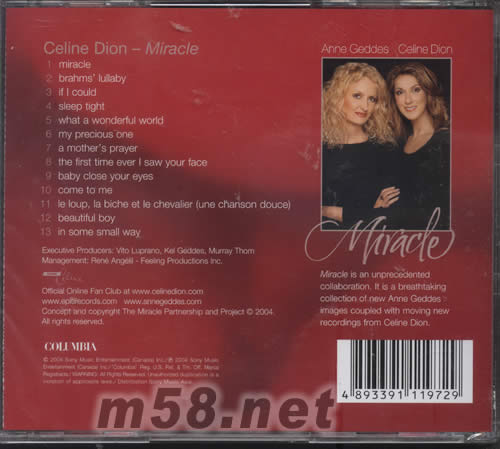 1、MIRACLE 2、BRAHMS’LULLABY 3、IF I COULD 4、SLEEP TIGHT 5、WHAT A WONDERFUL WORLD 6、MY PRECIOUS ONE 7、A MOTHER‘S PRAYER 8、THE FIRST TIME EVER I SAW YOUR FACE 9、BABY CLOSE YOUR EYES 10、COME TO ME 11、IE IOUP,LA BICHE ET IE CHEALIER (UNE CHANSON DOUCE) 12、BERUTIFUL BOY 13、IN SOME SMALL WAY