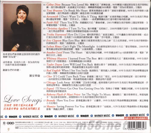 因為愛DIANE WARREN PRESENTS LOVE SONGS(m58.net) 18 OF THE MOST BEAUTIFUL SONGS WRITTEN FROM THE HEART 因為愛 巨星閃耀情歌最精選 收錄18首情歌創(chuàng)作天后黛安華倫歷年最美麗的大師杰作 席琳狄翁、艾利克萊普頓、克莉絲汀、唐妮布蕾斯頓、惠妮休斯頓、黎安萊姆絲、費絲希爾、史密斯飛船合唱團(tuán)…齊聚18位樂壇巨星生命中最重要的情歌代表 世界末日 / 因為你愛過我 / 女狼俱樂部 / 空中監(jiān)獄 / 落跑新娘 等浪漫電影主題曲 因為愛,情歌才能如此美麗;因為黛安華倫 他們成為閃耀巨星 我希望你們會喜歡這張很特別的創(chuàng)作專輯“因為愛”這些歌曲,是我的小孩,我為我的每一首創(chuàng)作歌曲感到驕傲。謝謝你們的聆聽。 - 黛安華倫