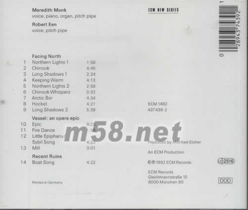 價格為估,以實到貨為準! FACING NORTH(m58.net) MONK一直在實驗舞臺上探索,與其說創新,不如說她一直在尋找人類與音樂的本真,最自由的狀態,因此,她的專輯可以用純粹形容,在她和她的伴唱所發出的聲音中,有肆意狂笑也不足為奇了,聽她的專輯你可以想像出很多肢體語言。 她是不可思議的,她混合了所有的她能涉及的藝術形式:音樂、舞蹈、行為、電影與Video。把約翰-凱奇的手與坎寧安的腳聯系在一起,她得了無數的獎,是紐約前衛音樂圈數一數二的女性。 MONK不是被喚醒的,而是她在喚醒沉睡的世界。她的唱歌幾乎是發出各種各樣的聲音——藏著各種秘密的舌間的顫動。這個神秘女人有能力穿過中世紀的吟唱,或者在非洲的沙漠里曼舞。她說:聲音是人類最初的工具,那是比詞匯更有雄辯性的語言。 MONK有一支她的思想附庸的合唱隊——Vocal Ensemble。六七個男女聲部,層次分明的游戲與探訪。當她真的進入一個單音里面,哼唱的連續不斷如波浪起伏,空間的長度被記錄了下來。