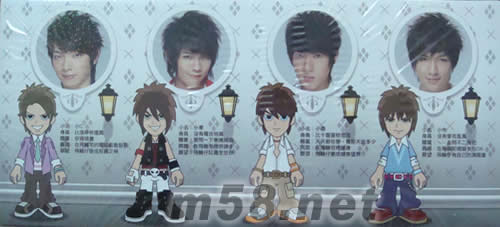 飛輪仔的飛輪宅(四仔珍藏套裝)(m58.net) 一套四仔珍藏套裝 每一套都有獨立的限量編號 公仔界新偶像 帥酷神迷再進化 *繼S.H.E超受歡迎的S.H.E JUNIOR火速席卷公仔界后,華研唱片另一天團飛輪海即日起正式推出飛輪海帥酷神迷再進化的迷你公仔組合。千呼萬喚公仔界最新偶像小小飛輪海就要誕生!!請大家拭目以待,準備迎接小小飛輪海迷你公仔的正式出道吧! *小小飛輪海迷你公仔由設計過眾多明星商品與演唱會週邊商品的名設計師不二良量身設計。四個公仔完全依照飛輪海個人特色與魅力打造。讓你一手掌握辰亦儒的帥,汪東城的酷,吳尊的神,炎亞綸的迷,只要喜歡,全部抱回家! *包裝內附贈小通關卡,憑卡就有機會贏得跟飛輪海真人接觸的機會! 除此之外,小小飛輪海迷你公仔正式出道前,華研唱片特別舉辦了公仔命名有獎比賽,請大家發揮創意,幫他們想一個可愛又超炫的團名吧! 詳細游戲規則請留意華研官網 在近期內公佈喔! *產品規格﹕公仔高約12公分,材質為PVC,四仔一組,超精美套裝,限量商品,歌迷最愛,玩家珍藏! 各種公仔個性說明 1. 小名:小C 身高:比漲停板還高 體重:你猜猜看 光趣:在飛輪宅的電腦前看股票 愿望:飛輪仔變成投資神 2. 小名:小東 身高:沒有電吉它高 體重:要問一下東媽媽喔 興趣:在飛輪宅里照鏡子 愿望:飛輪仔紅遍全世界 3. 小名:小尊 身高:比千層蛋糕還高 體重:天天都在變,看那天吃多少 興趣:在飛輪宅里練健身 愿望:飛輪仔變成健身猛男 4. 小名:小布 身高:沒有麥克風高 體重:~~去問不二良吧 興趣:在飛輪宅里唱卡拉OK 愿望:飛輪仔有自己的演唱會.