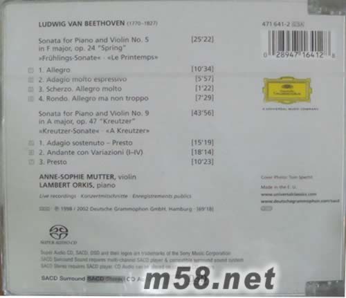 貝多芬小提琴奏鳴曲春 克羅采BEETHOVEN SPRING & KREUTZERSONI(m58.net) 安妮·索菲·穆特(Anne-Sophie Mutter)1963年6月29日出生於南德意志巴登的萊因費爾頓(Rheinfelden, Baden)。早年曾隨赫尼希伯格(福萊的學生)學琴。七歲獲全德青少年小提琴比賽第一名,1974年又在另一比賽中獲勝。赫尼希伯格逝世后,穆特考入阿伊達·斯托基教授所在的瑞士溫特圖爾音樂學院,并最終成為斯托基的學生。1977年隨卡拉揚參加薩爾茲堡音樂節,次年再度與卡拉楊合作,初次在柏林演出。 1979年獲“年度藝術家”獎,并獲德國唱片大獎(Deutscher Schallplattenpreis)。此后作為小提琴獨奏家和室內樂音樂家,頻繁地在歐洲、美國、加拿大和日本巡迴演出。1990年在倫敦和斯圖加特舉辦了“安妮·索菲·穆特音樂節”,從巴羅克時期到前衛音樂時期,多角度地展示了她的藝術才華。1995年,波蘭作曲家彭代雷茨基把作品《第二小提琴協奏曲》獻給她,在萊比錫初演,這次演出為她贏得了兩個格萊梅獎。1997年12月曾來中國演出,在北京世紀劇院舉行了勃拉姆斯小提琴奏鳴曲音樂會。獨奏之外,她也經常參加室內樂演奏,曾與大提琴家羅斯特羅波維奇、中提琴家基奧皮納組成三重奏,在各地廣泛演出。穆特是一位典型的德奧血統的演奏家,性格熱情,具有著嚴謹的思維邏輯和內在個性,這使她形成了優良的演奏素質和高品位的藝術修養。卡拉揚去世后,她的演奏向多元化發展,曲目不局限於德奧古典、浪漫等傳統作品,而加強了近現代作品的比重,經常演出盧托斯瓦夫斯基(Witold Lutoslawski)、莫雷(Norbert Moret)、彭代雷茨基和里姆(Wolfgang Rihm)等人的作品。穆特在從梅紐因、阿卡多、羅斯特羅波維奇等演奏家身上吸取了學到了許多有益的東西,曾被喻為成當代小提琴界的“女梅紐因”。