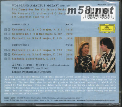 莫札特:小提琴協奏曲全集、交響協奏曲(m58.net) 為了紀念莫札特兩百五十週年冥誕,慕特錄製一系列莫札特小提琴作品專輯。在這一套全新的錄音裡,慕特要帶給大家與二十多年前卡拉揚時期不一樣的莫札特。 慕特六歲第一次聽到哈絲姬兒演奏的莫札特時,就深深被音樂中輕盈自然的流動性所吸引,接著史坦與葛羅米歐的錄音更讓慕特對於莫札特的小提琴作品神往不已。慕特認為,現代小提琴家詮釋的莫札特缺乏優雅、純潔與端莊樸素的感覺,年輕音樂家對於莫札特作品的態度則過於輕忽,認為莫札特的作品太過簡單,沒有任何炫人的技術而不屑演出。「莫札特的作品就像X光一樣,可以穿透你的靈魂。」慕特說。透過莫札特的音樂,演奏者最真實的內在往往會無法抑制的完全曝露出來。 詮釋上,慕特追求的感覺就像唱片封面上所呈現的素雅、精緻、細膩但是不脫華麗的感覺。慕特在這套唱片還同時扮演了「領導者」的角色,沒有指揮,而是由樂團跟著她要的音樂風格與效果一起創造屬於慕特的莫札特。