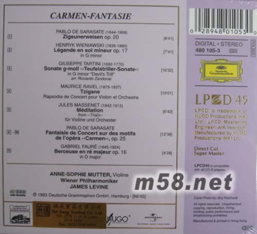 CARMEN FANTASIE 卡門幻想曲 LPCD(m58.net) anne-sophie mutter德國女小提琴家,阿伊達·施圖基的學生,嚴格說應是卡拉揚的學生.卡拉揚從她十幾歲起一直給予鼎力扶持,她也從卡拉揚那兒學到了對作品對比與節奏的強調.她和卡拉揚合作了一系列的唱片,其中最具特色的是貝多芬、布拉姆斯、門德爾松的協奏曲,穆特爾給予了很個性化的解讀.在卡拉揚的培養下,她呈現出一種青春激情.穆特爾的技巧其實并不很出色,但她的激情和卡拉揚教導她對樂句的處理,常常能帶來很美的音色.穆特爾與芝加哥樂團、萊文合作的貝爾格的協奏曲,是她的優秀曲目,此外,就是1995年9月在她丈夫死后一個月,獻給她亡夫的柏林愛樂大廳獨奏音樂會,這個現場錄音因為太多的感情投入,而在穆特爾的所有錄音中,成為最感人的一張.