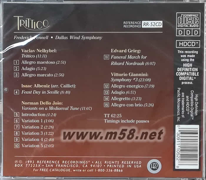 發(fā)燒三件頭 TRITTICO RENNELL DALLAS WIND SYMPHONY HDCD專輯背面圖片
