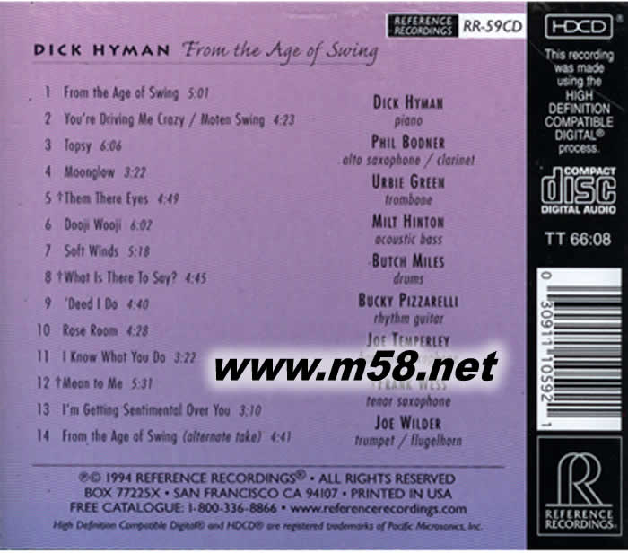 From The Age Of Swing 搖擺年代(m58.net) 美國典范錄音公司RR旗下的簽約音樂家迪克?海曼(Dick Hyman),就是一位熱衷于搖擺時代的浮世情懷的爵士鋼琴家。 1994年的《搖擺年代》,是一張標準的大樂團(Big band)式演奏錄音。迪克?海曼運用他在業界的號召力,集合了眾多高手,其中包括貝西伯爵的御用鼓手布奇?邁爾斯、藍調爵士吉他老將布基?皮扎瑞利(也就是當代著名爵士吉他歌手約翰?皮扎瑞利的父親)、爵士長號大師烏爾比?格林、老牌薩克斯風手弗朗克?魏斯等8位明星樂手。這些加盟的樂手雖然年齡、來歷迥異,但是他們擁有共同的一點,那就是對搖擺爵士樂的熱愛。 《搖擺年代》專輯收錄的14首樂曲中,除首尾兩曲系由樂團成員共同創作的新曲外,其余都是本尼?格魯德曼、保羅?懷特曼、貝西伯爵、艾靈頓公爵等人在二三十年代經常演出的作品,包括《多吉伍吉》、《柔風》、《你讓我瘋狂》、《我了解你所做的》等名作。 作為主奏者的迪克?海曼,自然擔當起整個樂團的靈魂人物,率領樂手們共赴這場搖擺盛宴。同臺演出的其他樂手,由于個個都是身懷絕技而且經驗豐富的高手,對舊式大樂團搖擺樂有著充分的認識,因此配合起來非常默契自如,在主奏者的引導下發揮出各自絕活,成就了一次高水準的演出錄音。
