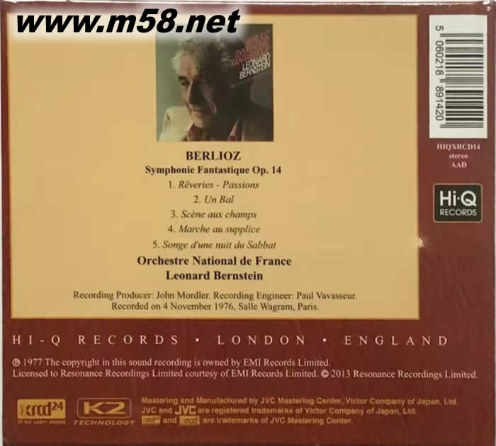 Symphonie Fantastique Op. 14 白遼士 XRCD(m58.net) BERLIOZ Symphonie Fantastique Op. 14 Orchestre National de France Leonard Bernstein 由JVC獨家開發的XRCD,是經由JVC研發的K2雷射定位錄音技術,重新製作母帶。JVC獨家開發的K2超級數字編碼器,可消除極大的低電頻信號的諧波失真,減少系統運行時不純淨的交流電對數碼的雜波干擾,這樣技術使得原音得以忠實重現。XRCD全部按照16bit / 44.1KH2的CD標準製作,所以不需要特殊的CD唱盤或譯碼器就能明顯展現出與眾不同的優越性。 XRCD24是JVC XRCD系列技術的最高規格,CD的空間感更大,細節度更多,聲音的飽滿度更高,極度完美無暇的自然音場讓XRCD24的愛用者成為最頂極的聲音饗宴。 幻想交響曲為法國交響音樂劃開了序幕,在這之前,並沒有法國人寫作如同貝多芬一樣份量的交響音樂,這首白遼士25歲時的作品,是他狂戀一位英國女演員後的心情寫照,但在交響曲中,他以標題式的描寫了主角服用鴉片後的狂亂心情,卻不知是否為他真實生活的寫照。這位他所狂戀的英國女演員,後來就嫁給他成為他的妻子。不同於貝多芬的交響曲,這首幻想交響曲卻是名符其實的標題音樂,在每個樂章之前,白遼士都加上了標題,詳細地描寫曲中的場景,分別是「夢幻、熱情」、「舞會」、「野外」、「向斷頭臺前進」、「妖魔安息日的夜之夢」。而其中每一段音樂則都都驅使著獨特的管弦樂法,以求表現出白遼士想像中的畫面。指揮家伯恩斯坦在二十世紀的名聲主要和他的形象大量出現在電視機發明後的嬰兒潮人口的面前有很大的關係,他是音樂史上第一位主持電視節目的指揮家,他主持的一系列古典音樂節目,讓許多美國人第一次接觸到古典音樂,推廣了古典音樂,也拓展了他的聲名。他的身份和知名度也讓他可以自由灌錄、指揮任何他想要探索的曲目,不用考慮票房因素。這份錄音是他在70年代時的作品,當時他一系列地探討了白遼士的管弦音樂,是他對七○年代興起的白遼士狂熱的回應。