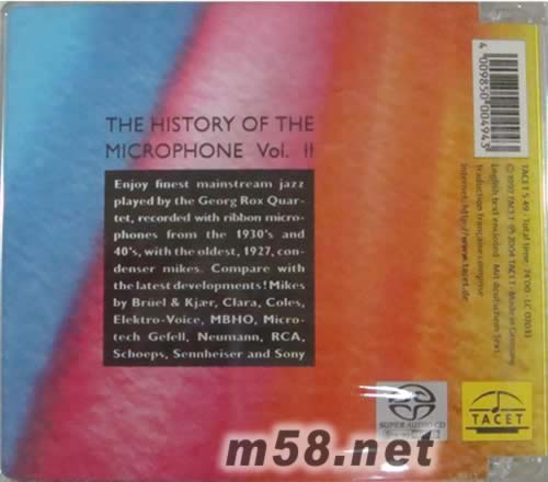 膽咪2 DAS MIKROFON VOL 11 麥克風萬歲第二輯 爵士篇 SACD(m58.net) 兼容SACD機或普通CD機播放 Tacet拉丁文意為“沉默的”,也就是不與別人做同樣的事,亦即Tacet是杰出且與眾不同的。Tacet的創建者是德國有名的錄音專業教授,他創立這一家公司就是想表現最高技藝的音響效果,全部專輯都是選用最專業的器材、聘用最專業的工程人員及最優秀的音樂家,所以Tacet所出產的音樂產品是發燒友測試音響及聆賞音樂非常好的選擇。 Tacet這家公司在業界以真空管麥克風錄音著名,很多樂友在買了Tacet的音樂專輯之后,均訝異Tacet竟能以很多比我們年紀還大的古董級的真空管麥克風,錄下這么富有甜美光澤的古典及爵士音樂,以至于在1994-1996年的時候,港臺地區均刮起一陣Tacet發燒旋風,眾發燒友的發燒收藏榜單之中如果沒有一張Tacet的專輯,那么很有可能會被認為發燒友的資歷及對唱片市場生態的熟悉度有限。 杰出的錄音師都知道,挑選好的麥克風進行收音,是擁有發燒錄音效果的關鍵因素。在這張《萬歲!麥克風2》中,Tacet再次宣示制作專業錄音品質的決心。在Neumann CMV3、 M49、U47、球型等價值連城的真空管麥克風,以及最具臨場感的Dummy Head假人頭麥克風的共享盛宴中,Tacet的錄音師將爵士四重奏音樂該有的“層次感”、“空間感” 、“定位感”顯露無遺,并將各種樂器的流暢表現淋漓發揮。值得一提的是,片中還使用了最老的冷凝麥克風,真是叫人如癡如醉,過癮至極。